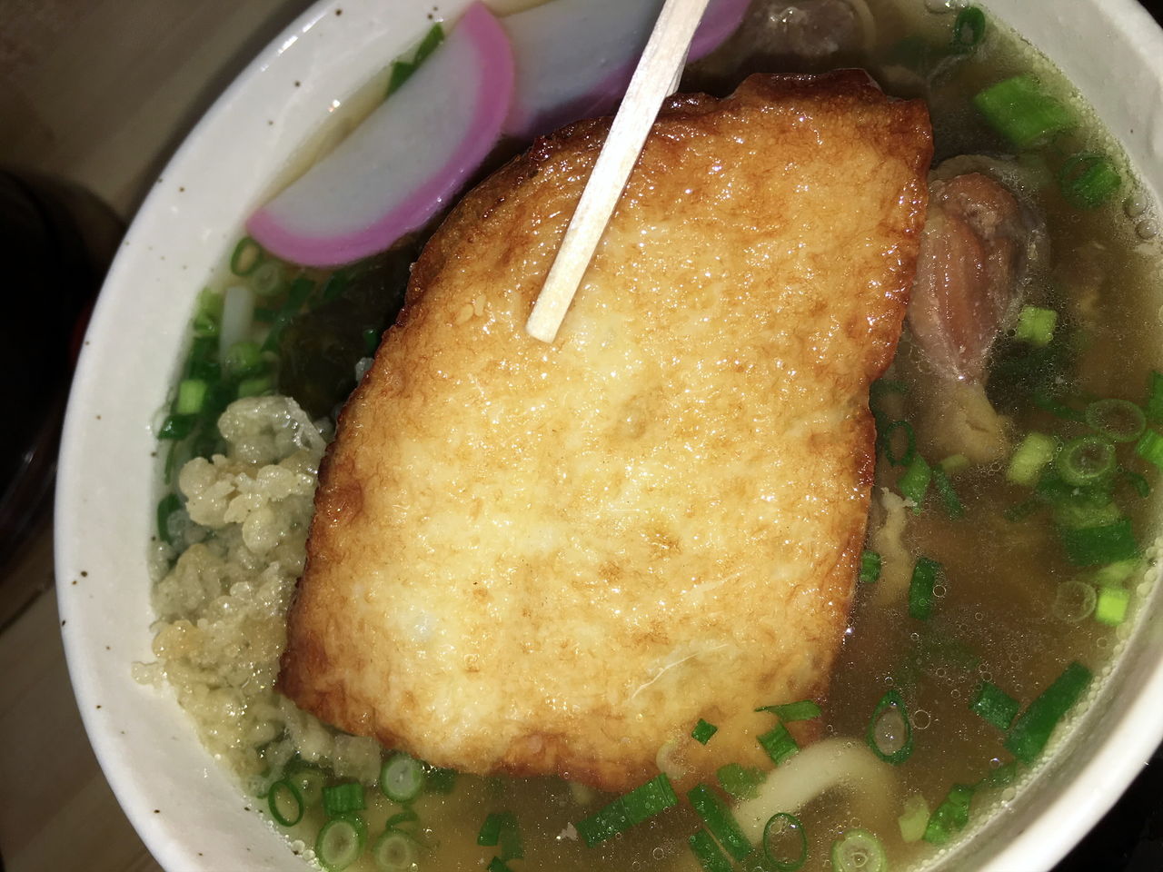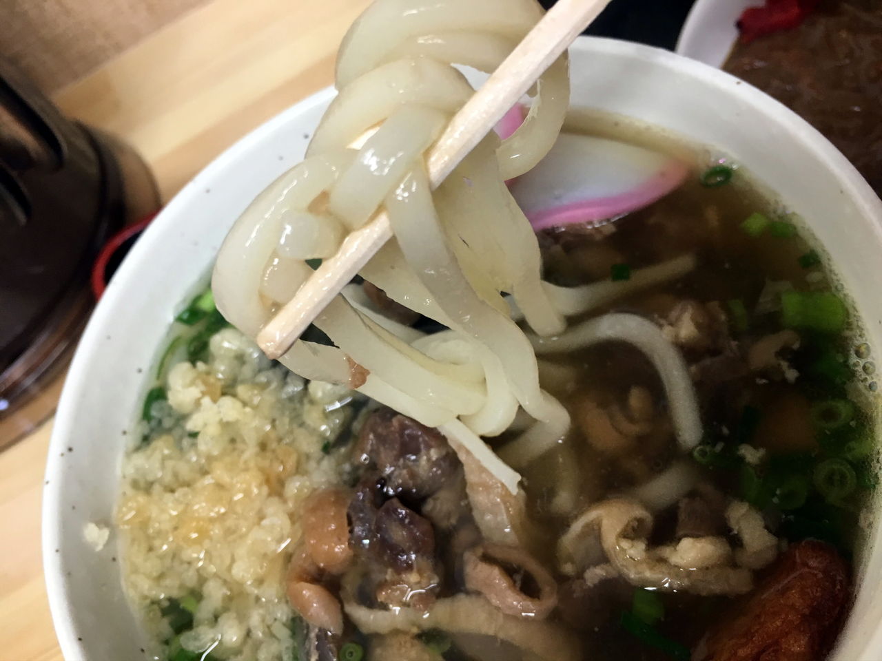 うどんは鶏煮汁をかえしに使い、コクと甘味を出しているようだ。このため出汁は