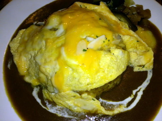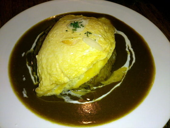 プルンとしたオムレツがライスに乗っかるカレー。真ん中から割って全体を覆う。割る前