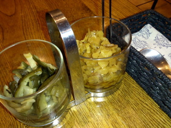 薬味類 毒々しくない色の福神漬で、好印象。ピクルスもなかなか。