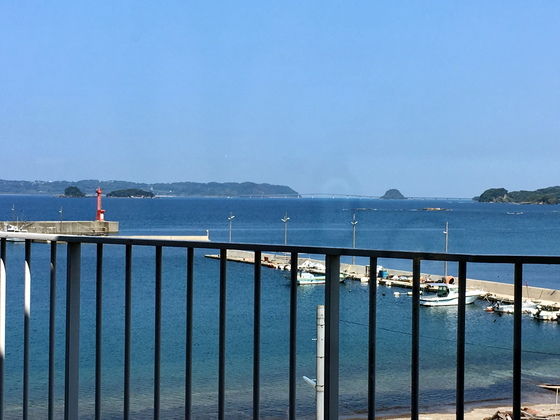 レストランの窓から見える景色だけ・・・左が角島。うっすらと角島大橋が見える。実際